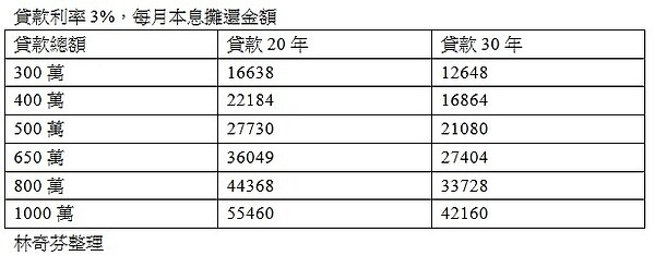 不過,目前台灣房價居高不下,再加上薪水族薪資水準不高,因此,在利率不變的前提下,若將貸款期拉長為30年,則可貸款金額可提高一些。如每月房貸1.6萬元,可貸款400萬元,每月房貸2.8萬到3.5萬元,可貸款650萬元到800萬元。